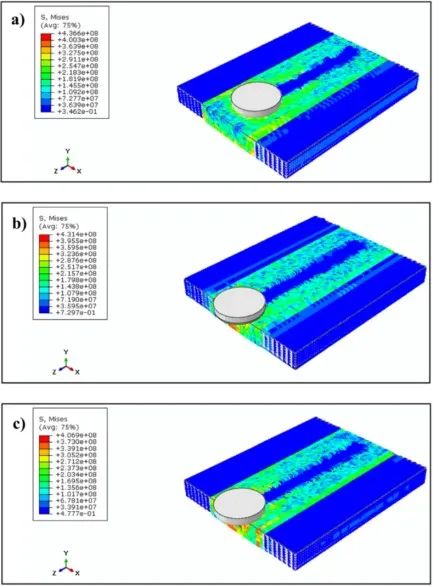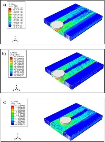 圖2 在900 rpm的恒定轉(zhuǎn)速和不同轉(zhuǎn)速下焊接試樣中的殘余應(yīng)力場(chǎng)分布(未預(yù)熱):(a)50 mm/min(b)100 mm/min和(c)150 mm/min