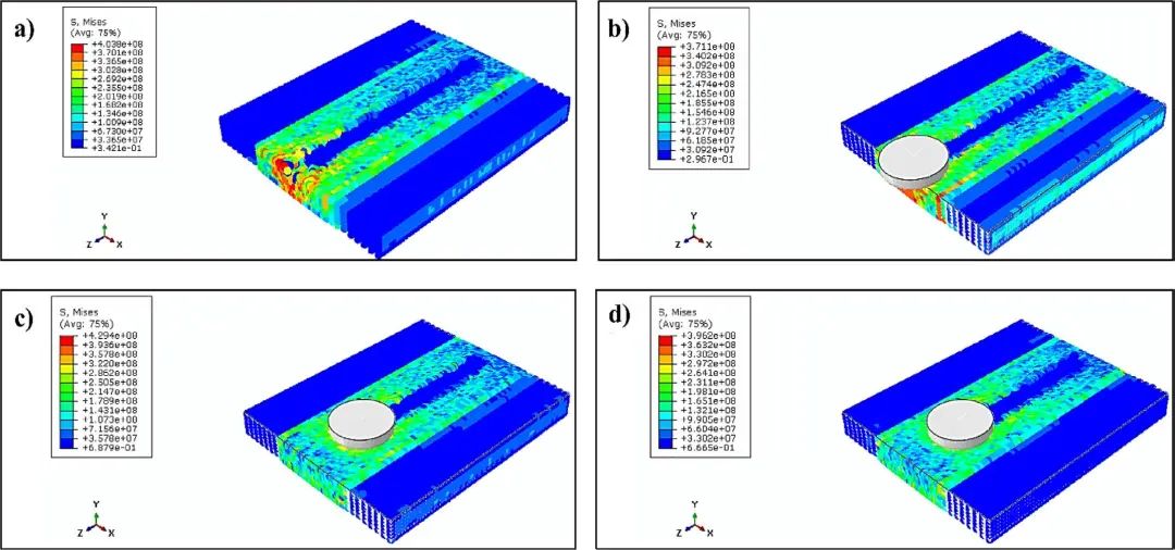 圖3 不同工藝條件下攪拌摩擦焊試樣的殘余應(yīng)力場(chǎng)分布:(a)轉(zhuǎn)速600 rpm、焊接速度100 mm/min、未預(yù)熱;(b)轉(zhuǎn)速600 rpm、焊接速度100 mm/min、預(yù)熱;(c)轉(zhuǎn)速1200 rpm、焊接速度150 mm/min、未預(yù)熱;(d)轉(zhuǎn)速1200 rpm、焊接速度150 mm/min