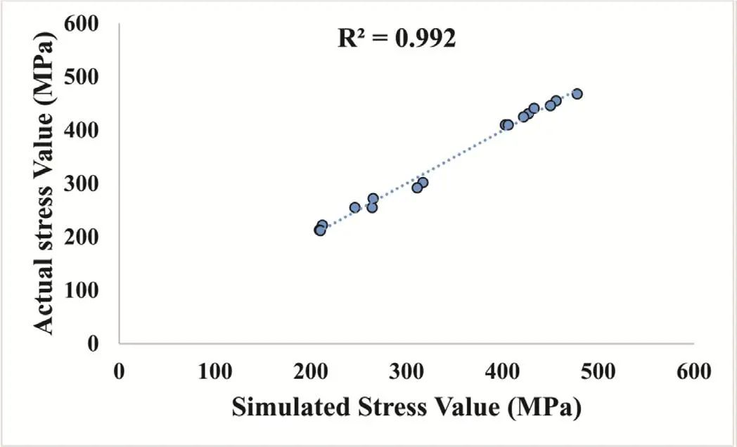 自適應(yīng)神經(jīng)模糊推理系統(tǒng)(ANFIS)是一種具備自適應(yīng)學(xué)習(xí)能力和基于邏輯規(guī)則推理的高性能計(jì)算模型。通過構(gòu)建該模型并不斷優(yōu)化,輸入預(yù)定轉(zhuǎn)速、焊接速度、預(yù)熱和焊縫中心距離,模擬焊接參數(shù)對(duì)殘余應(yīng)力的影響規(guī)律。在合理范圍內(nèi)隨機(jī)選取16組模擬數(shù)據(jù)結(jié)果,與實(shí)驗(yàn)數(shù)據(jù)進(jìn)行比較以評(píng)估模型的準(zhǔn)確度,擬合結(jié)果如圖4所示,表明該模型的精確度較高。