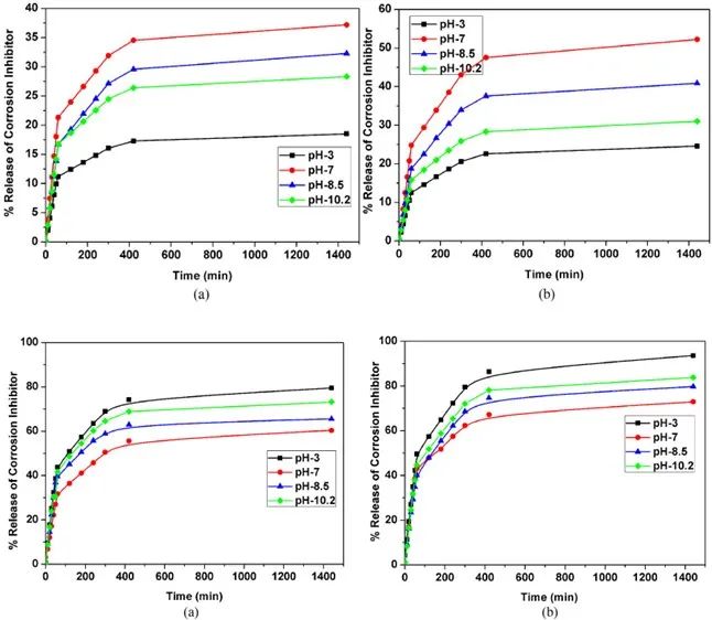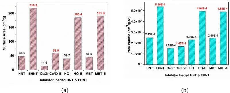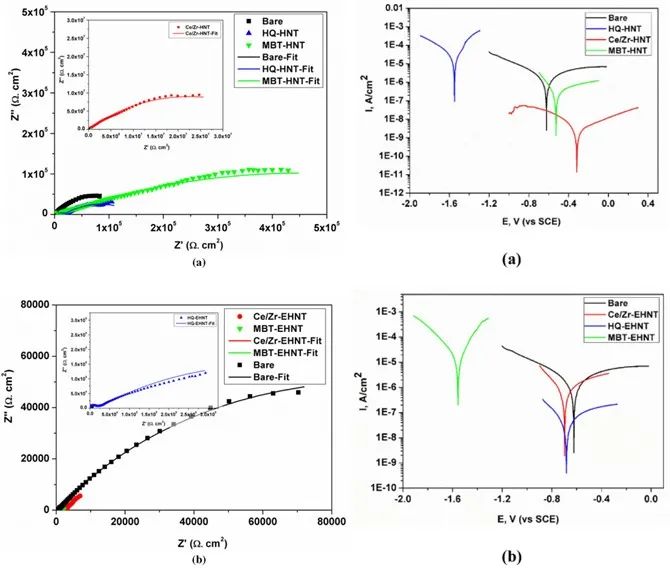 近日,來自印度粉末冶金與新材料國際研究中心的R. Subasri博士等人利用埃洛石納米管(HNTs)和刻蝕后的埃洛石納米管(EHNTs)作為納米容器,分別負載了Ce3+-Zr4+、2-巰基苯并噻唑(MBT)和8-羥基喹啉(HQ)等緩蝕劑,對比研究了HNTs和EHNTs中不同緩蝕劑分子的負載釋放動力學(xué)。研究結(jié)果表明,在3.5 wt.% NaCl水溶液中浸泡120小時后,Ce3+-Zr4+-HNTs涂層的電化學(xué)阻抗Rct值為4.464×107 Ω·cm2,自腐蝕電流密度最低,為2.667×10-9 A/cm2,表現(xiàn)出最好的腐蝕防護能力;通過對HNTs和EHNTs釋放的緩蝕劑進行定量分析,發(fā)現(xiàn)Korsmeyer-Peppas模型最符合緩蝕劑的釋放動力學(xué)過程。