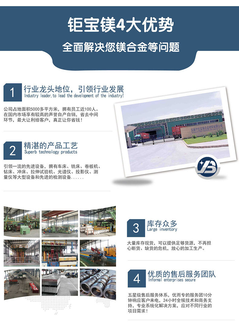 東莞市鉅寶鎂合金材料有限公司是一家專業(yè)從事鎂合金系列產(chǎn)品的研發(fā)、生產(chǎn)、銷售為一體的企業(yè),多年來(lái),在同行業(yè)和消費(fèi)者的心中了贏得非常值得信賴的口碑,本司主要產(chǎn)品有:鎂合金板、鎂合金管、鎂合金棒、鎂合金型材、鎂豆、鎂絲、蝕刻板、雕刻板、及鎂合金機(jī)加工產(chǎn)品,主要應(yīng)用于:航天、軍工、軌道、交通、新能源汽車、智能制造、3C等各種領(lǐng)域,我司的產(chǎn)品暢銷美、歐、日、韓等各國(guó),另外我司還通過(guò)了ISO9001:2015國(guó)際質(zhì)量管理體系認(rèn)證,擁有規(guī)范和完善的質(zhì)量體系,公司秉承“誠(chéng)信、專業(yè)、共贏”的經(jīng)營(yíng)理念,堅(jiān)持用戶至上,以優(yōu)質(zhì)的服務(wù)來(lái)服務(wù)好每一位客戶,堅(jiān)持技術(shù)上不斷創(chuàng)新、不斷超越,用我們的優(yōu)質(zhì)服務(wù)以及專業(yè)技術(shù)為客戶提供產(chǎn)品的后續(xù)表面處理及售后服務(wù)。